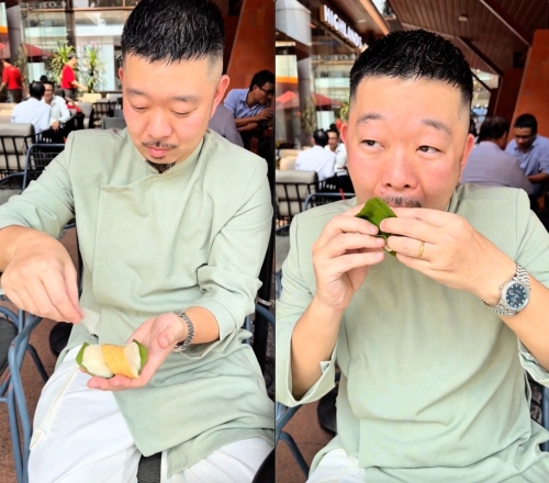 Sau khi nhận được câu trả lời rằng lớp lá bên ngoài chỉ dùng để gói, anh mới nhẹ nhàng bóc lá ra rồi bắt đầu thưởng thức.