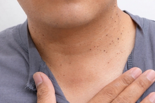 Kháng insulin người bệnh xuất hiện nhiều vùng da sẫm màu, mịn như nhung ở các nếp gấp như cổ, nách, bẹn kèm theo nhiều nốt mụn thịt. Ảnh: Healthline. |