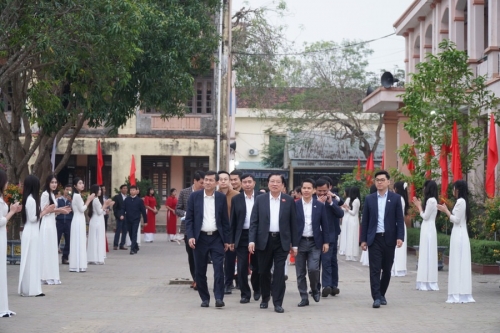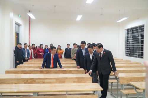 Đoàn công tác thăm cơ sở vật chất mới tại Trường THPT Nguyễn Xuân Ôn. Ảnh: Hồ Lài |