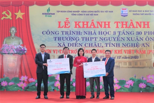 Công trình Nhà học 3 tầng với quy mô 30 phòng học là món quà ý nghĩa do Tổng Công ty Khí Việt Nam PV GAS, đơn vị thuộc Tập đoàn Công nghiệp - Năng lượng Việt Nam tài trợ cho Trường THPT Nguyễn Xuân Ôn với tổng mức đầu tư hơn 47 tỷ đồng. Dự án được khởi công từ tháng 1/2025 và hoàn thành chỉ sau hơn 300 ngày thi công, vượt tiến độ một năm so với kế hoạch, đảm bảo về chất lượng, mỹ quan và an toàn lao động.