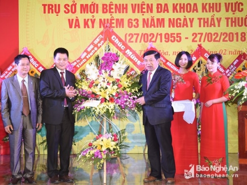 Lãnh đạo tỉnh Nghệ An tặng hoa chúc mừng tập thể y, bác sĩ Bệnh viện Đa khoa Khu vực Tây Bắc nhân dịp đưa trụ sở mới vào hoạt động và Kỷ niệm Ngày Thầy thuốc Việt Nam 27-2. Ảnh: Thành Chung |