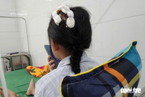 Trên đầu cháu L. có 3 vết thương hở, trong đó 2 vết thương ở vùng đỉnh đầu. Các bác sĩ xử lý và tiến hành khâu 7 mũi. Sau ít ngày điều trị, sức khỏe, tinh thần cháu L. đã ổn định trở lại.