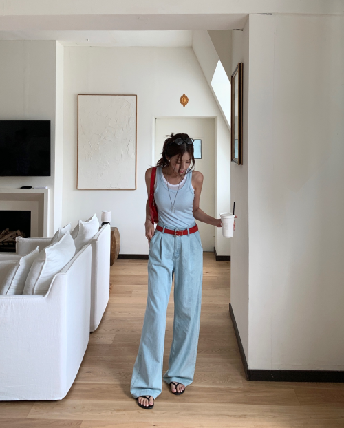 Không có gì phù hợp với mùa hè hơn áo hai dây. Khi kết hợp cùng quần jeans ống rộng, bộ đôi này tạo nên một tổng thể cân đối giữa sự phóng khoáng và quyến rũ.