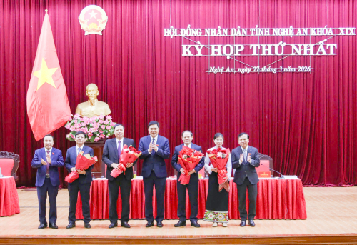 Các đồng chí lãnh đạo tỉnh tặng hoa chúc mừng các đồng chí được bầu giữ chức Chủ tịch, Phó Chủ tịch UBND tỉnh |