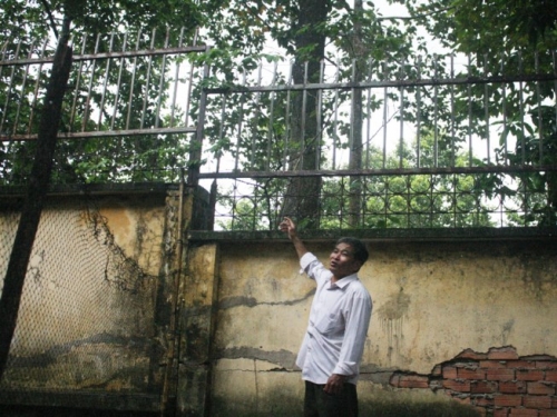Ông Nguyễn Ngọc Ánh bên tường rào nhà ông mà bị hại Trung đã trèo qua |