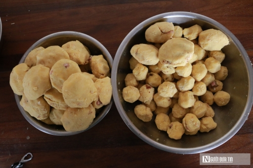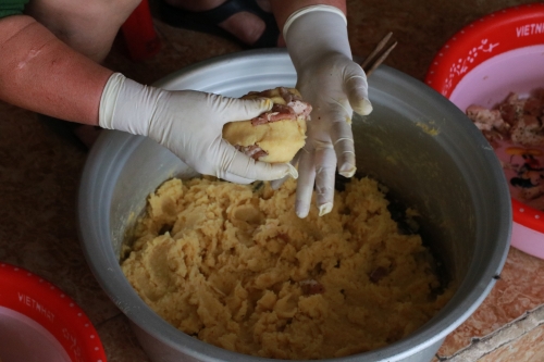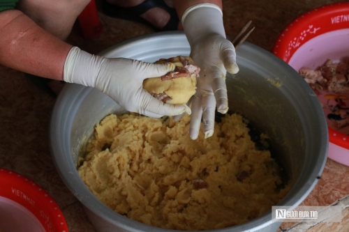 Hầu hết các hộ gia đình làm bánh ở làng Vĩnh Hoà dùng thịt tươi, vừa mới mổ xong. "Thịt để làm bánh cũng được lựa chọn loại thịt ngon nhất như: nạc vai, ba chỉ. Nhân thịt nếu nạc cả sẽ gây khô, mỡ nhiều sẽ gây ngán. Vì vậy, nguyên liệu thịt cũng được lựa chọn chuẩn. Đậu xanh và nếp chúng tôi chủ yếu nhập từ bên Lào về", ông Hoàng Mã Lan, trú tại làng Vĩnh Hoà, chia sẻ. |