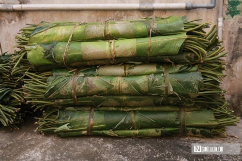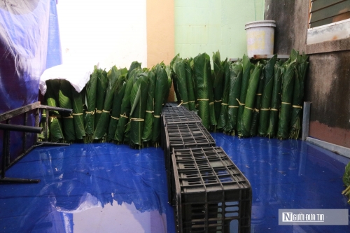 Là vụ sản xuất lớn nhất trong năm, sản lượng tiêu thụ lên cả triệu chiếc bánh nên thời điểm cận Tết, người dân làng nghề Vĩnh Hoà phải chạy đua với thời gian. Vì sợ gần Tết đắt đỏ, từ đầu tháng Chạp, gia đình bà Nguyễn Thị Nhường, 58 tuổi, trú tại làng Vĩnh Hoà đã phải chuẩn bị một số lượng lớn nguyên liệu cho “mùa làm ăn lớn nhất trong năm”. Lá dong, lá chuối, nếp, đậu xanh, lạt buộc chất từ trong nhà ra đến ngoài sân. |