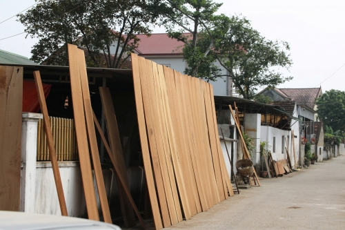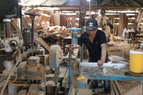 Từ đầu làng, tiếng máy cưa, tiếng đục đẽo vang lên đều đặn từ sáng đến tối, hòa với mùi gỗ mới tạo nên không gian lao động đặc trưng của làng nghề lâu đời. |