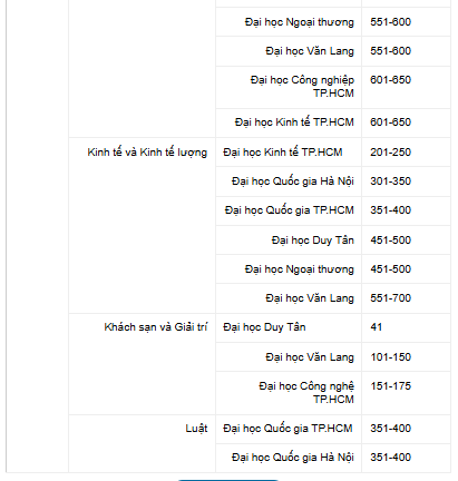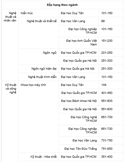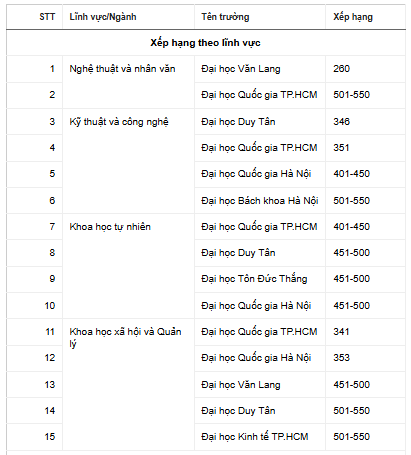 Xét theo lĩnh vực, Đại học Văn Lang dẫn đầu trong nhóm Nghệ thuật và Nhân văn (hạng 260). Đại học Quốc gia TP.HCM đứng đầu cả nước ở hai lĩnh vực Khoa học tự nhiên (hạng 401-450) và Khoa học xã hội và quản lý (hạng 341), trong khi Đại học Duy Tân tiếp tục giữ vị trí cao ở lĩnh vực Kỹ thuật và Công nghệ (hạng 346).
