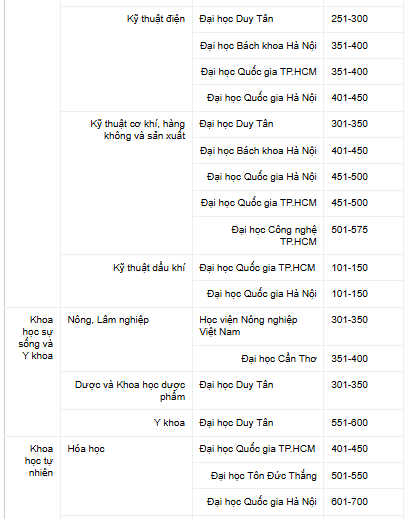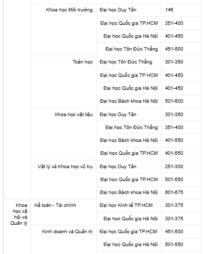 Trong đó, nhóm Nghệ thuật và Nhân văn lần đầu được ghi nhận, ở nhóm 501-550 thế giới. Các lĩnh vực còn lại đều cải thiện thứ hạng, gồm Kỹ thuật và Công nghệ (hạng 351), Khoa học xã hội và quản lý (hạng 341), và Khoa học tự nhiên (nhóm 401-450).