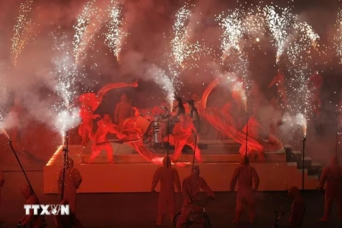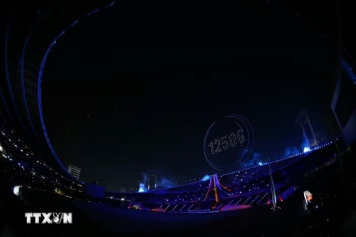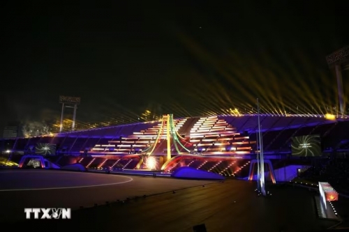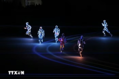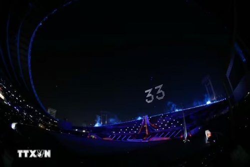 Màn trình diễn ánh sáng tuyệt vời trong lễ khai mạc SEA Games 33. (Ảnh: Minh Quyết/TTXVN ) |