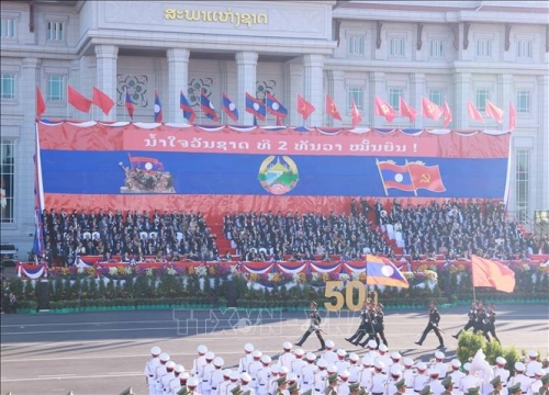 Lễ kỷ niệm, diễu binh, diễu hành chào mừng 50 năm Quốc khánh nước CHDCND Lào. Ảnh: Thống Nhất/TTXVN |