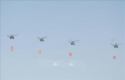 Biên đội máy bay trực thăng mang cờ bay trên bầu trời khu vực tổ chức lễ kỷ niệm. Ảnh: Thống Nhất /TTXVN |