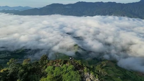 Nhờ địa hình cao và điều kiện thời tiết thuận lợi, đỉnh Mu Náu thường xuyên xuất hiện hiện tượng mây tích tụ dày vào sáng sớm. Từ khoảng 5h đến 6h, những khối mây trắng xóa trôi lững lờ dưới chân núi, tạo nên khung cảnh “biển mây” bồng bềnh, khiến nhiều du khách không khỏi choáng ngợp. Ảnh Tiệm cà phê Mu Náu Ơi |
