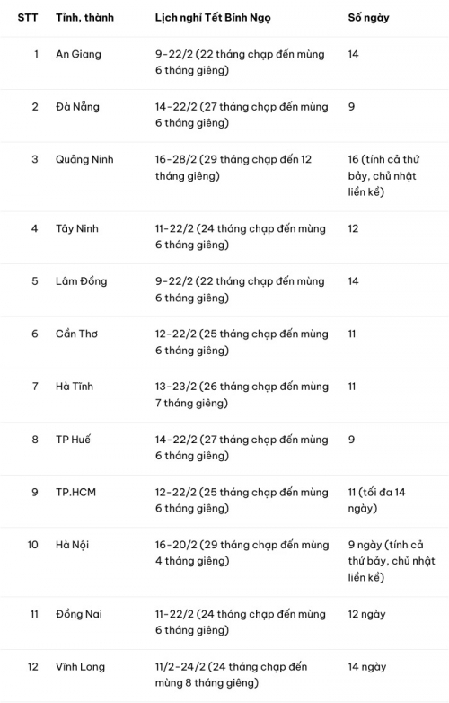 Theo thông báo mới nhất của Sở GD&ĐT các địa phương, An Giang, Vĩnh Long và Lâm Đồng đang dẫn đầu về thời gian nghỉ Tết với 14 ngày liên tục.