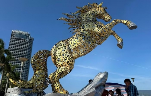 Linh vật ngựa sắt vàng được ghép bằng tên 94 xã, phường, đặc khu Hoàng Sa và tên Thành phố Đà Nẵng đặt trước khu vực trung tâm hành chính thành phố, cạnh bờ sông Hàn. (Ảnh: Báo Nhân Dân) |
