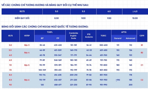 Các chứng chỉ tiếng Anh quốc tế sẽ được quy đổi điểm như sau: