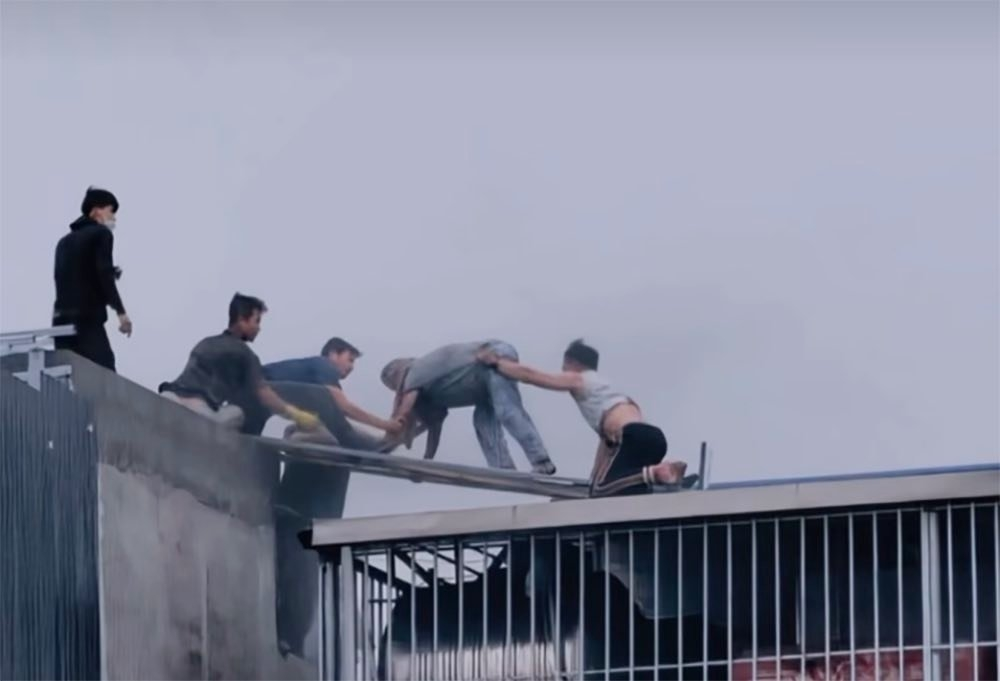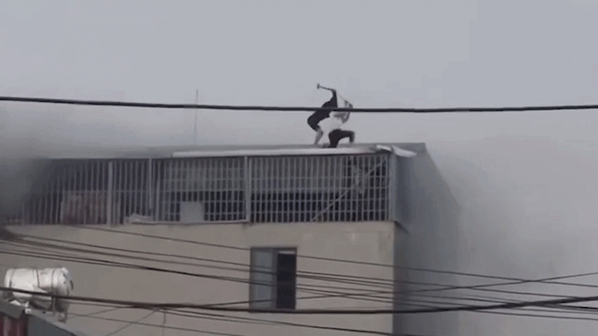 Hai người đàn ông dùng búa phá mái tôn cứu người. Ảnh chụp màn hình |
