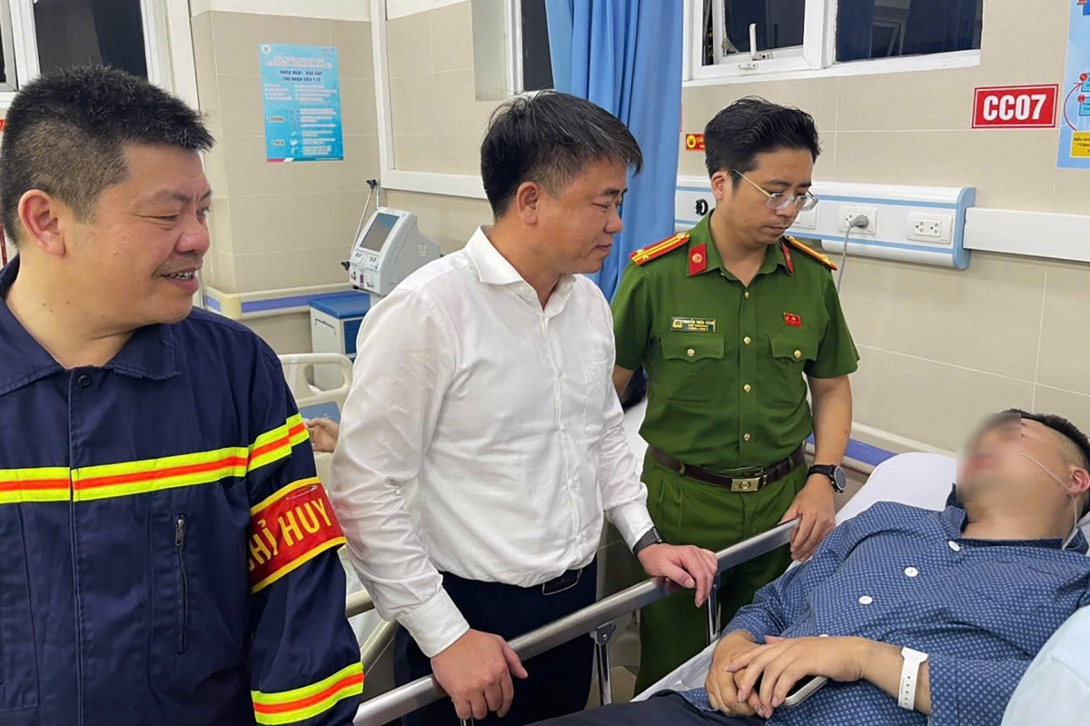 Đại diện UBND phường Hoàng Mai cùng lực lượng Cảnh sát PCCC&CNCH thăm hỏi các nạn nhân được chăm sóc sức khỏe ở Bệnh viện Thanh Nhàn. Ảnh: CACC |