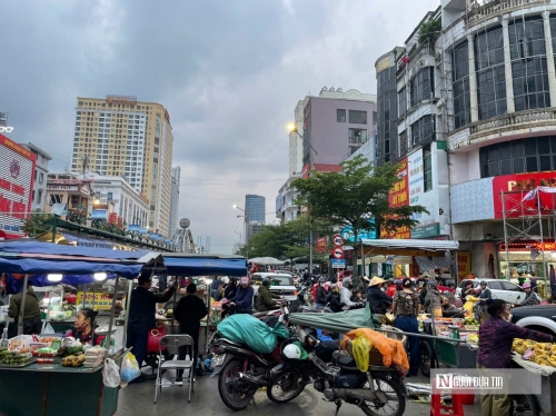 | Các phương tiện như xe máy, xe thồ, thúng mẹt trải dài ra lòng đường, vỉa hè. Tuyến đường Lê Hồng Sơn có thời điểm bị tắc nghẽn do lượng người mua bán tập trung quá lớn. |