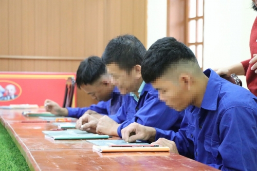 Dưới sự hướng dẫn tận tình của Đại úy Nguyễn Thị Yến và chị Nguyễn Thị An Gia, cán bộ Giáo dục - Dạy nghề, 4 nam học viên cặm cụi nắn nót từng con chữ.
