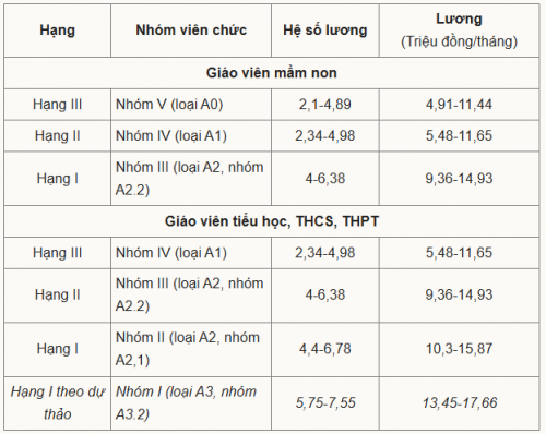Trước đó, trong dự thảo hồi tháng 9 năm ngoái, Bộ dự kiến xếp nhà giáo thành ba nhóm: giáo viên, giáo viên chính, giáo viên cao cấp, tương đương bậc III, II và I hiện nay. Riêng với giáo viên cao cấp (hạng I), hệ số lương sẽ từ 5,75 đến 7,55 (nhóm A3.2), tăng so với mức 4,4-6,78 hiện tại, còn lại giữ nguyên.