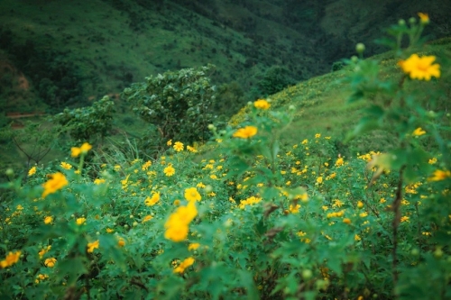 Dưới chân núi, những khóm dã quỳ mọc thành từng luống, phủ kín hai bên con đường dẫn vào Chư Đăng Ya. Sắc hoa vàng điểm tô trên nền lá xanh tốt, trở thành phông nền hoàn hảo cho những khung hình mùa hoa khiến du khách không thể rời mắt. Hoa bắt đầu nở rộ từ giữa tháng 11 và kéo dài đến đầu tháng 12, nhuộm vàng cả vùng cao nguyên trong những ngày đầu mùa khô. |