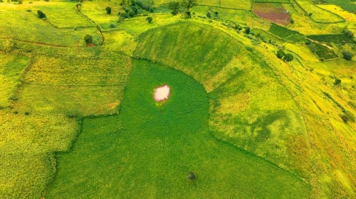 Nhìn từ trên cao, những thửa ruộng vuông vức nối tiếp nhau, tạo nên bức tranh thiên nhiên ngoạn mục với gam màu xanh, vàng đan xen giữa lòng cao nguyên. |