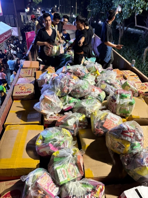 Những gói hàng cứu trợ được chất lên xe của chị Hạnh. |