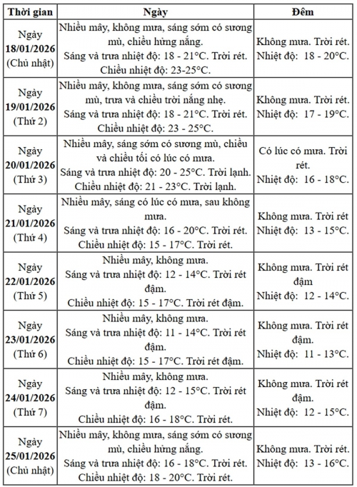Khu vực Trung Bộ, từ 18–20/1/2026, thời tiết phổ biến không mưa, ngày nắng. Riêng khu vực từ Thanh Hóa đến TP Huế, đêm và sáng trời rét. Từ 21–23/1/2026, khu vực từ Quảng Trị đến Quảng Ngãi có khả năng xuất hiện mưa, mưa rào rải rác. Đến 24–25/01/2026, thời tiết ổn định trở lại, ít mưa. Khu vực từ Thanh Hóa đến Huế tiếp tục trời rét, phía Bắc có nơi rét đậm.