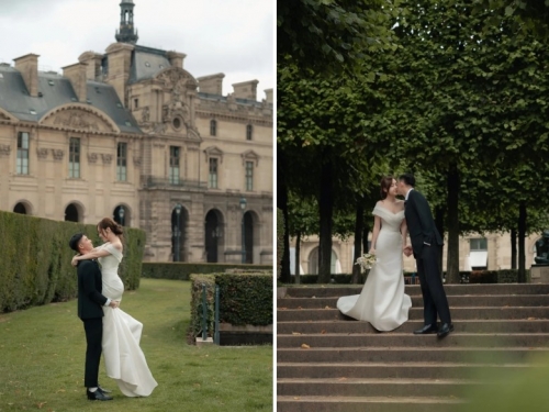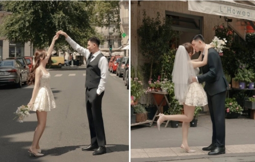 Văn Chuẩn - Dương Hà trao nụ hôn trước một cửa hàng hoa nằm gần đại lộ Rapp, Paris. Đây là địa điểm chụp ảnh với tháp Eiffel lãng mạn, đậm chất Pháp bậc nhất. Ảnh: Quan Văn Chuẩn/Facebook. |