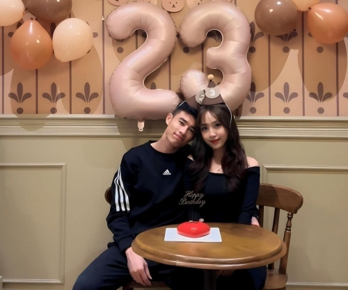 Văn Chuẩn - Dương Hà bắt đầu công khai mối quan hệ từ năm 2020. Kể từ đó, anh thường xuyên đăng tải hình ảnh tình tứ của cả hai trên trang cá nhân, kèm lời nhắn ngọt ngào. Trong trận chung kết U23 Đông Nam Á năm 2023, sau khi cản phá thành công cú sút của cầu thủ U23 Indonesia ở chấm luân lưu 11 m, Văn Chuẩn chạy về phía bạn gái thả tim. Hành động thu hút sự quan tâm của người hâm mộ bóng đá thời điểm đó. Ảnh: Quan Văn Chuẩn/Facebook. |