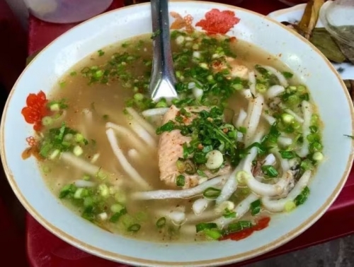 Thịt cá được ướp với hành tím, tỏi, tiêu và ớt cho thấm rồi xào sơ, trong khi phần lòng cá được xào riêng để giữ độ béo. Khi nước dùng sôi, sợi bột được thả vào, nấu đến khi trong và mềm thì múc ra tô, rắc thêm hành lá, tiêu bột, ớt tươi để dậy hương. Ảnh O Huyen |