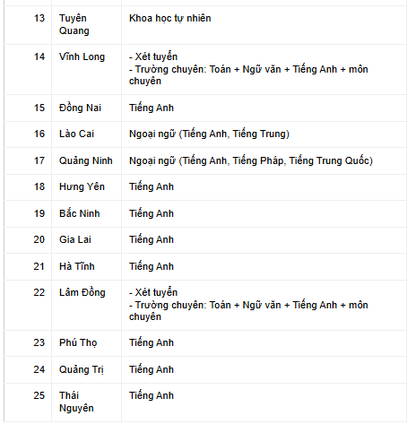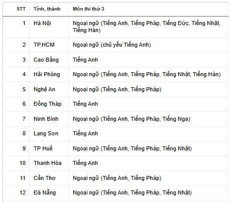 Tính đến nay, 25/34 tỉnh, thành trên cả nước đã công bố môn thi thứ ba. Phần lớn các địa phương lựa chọn Tiếng Anh hoặc Ngoại ngữ. Cụ thể như sau: