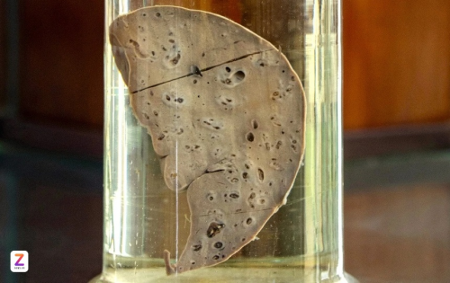 Mẫu vật gan người nhiễm sán được thu thập vào năm 1990 và trưng bày trong bảo tàng Viện Sốt rét - Ký sinh trùng - Côn trùng Trung ương. Ảnh: Việt Linh. |