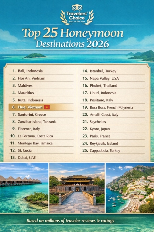Theo công bố từ giải thưởng Travelers’ Choice Best of the Best Awards 2026 của Tripadvisor, Huế đứng thứ 6 trong danh sách 25 điểm đến trăng mật lãng mạn nhất thế giới.