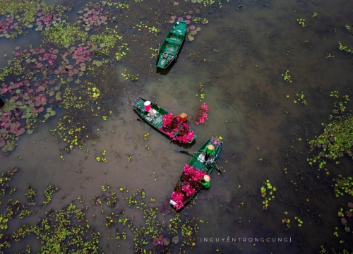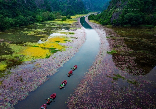 Cuối thu đầu đông, cánh đồng Tam Cốc (Ninh Bình) mang vẻ đẹp khác lạ, không phải sắc vàng óng ánh của lúa mà là màu hồng của hoa súng.
