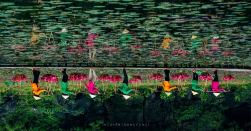 Hoa súng vốn đã có màu đậm nên để có bức ảnh đẹp du khách nên chọn trang phục có màu nhã nhặn, nhẹ nhàng, tông màu pastel sẽ nổi bật giữa không gian bên dòng Ngô Đồng.