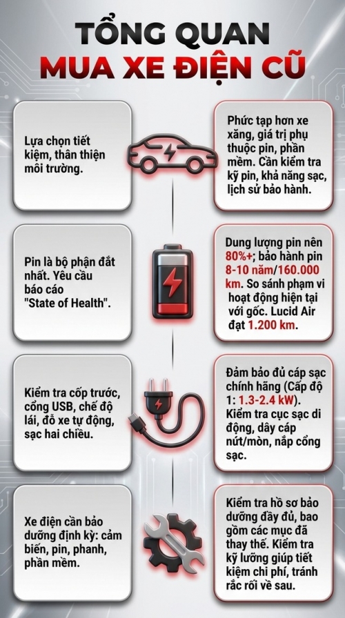 Việc mua xe điện đã qua sử dụng đòi hỏi kiểm tra kỹ hơn xe xăng, do giá trị phụ thuộc lớn vào pin và hệ thống điện tử. Yếu tố quan trọng nhất là tình trạng pin, cần xem báo cáo “State of Health” và so sánh quãng đường thực tế với thông số ban đầu; pin còn khoảng 80% được xem là chấp nhận được.