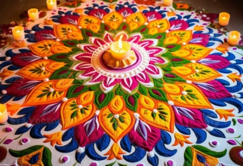 Được biết đến với nhiều cái tên khác như kolam, muggu hay mandana, nghệ thuật rangoli là cách thể hiện những hình vẽ trên mặt phẳng (nền đất) bằng bột gạo hoặc cát nhuộm màu cùng với bột mì và cánh hoa. Rangoli biểu thị cho tín ngưỡng, sự tôn thờ của người dân đến các vị thần trong Hindu giáo và cũng được xem là biểu tượng cho sự chào đón.