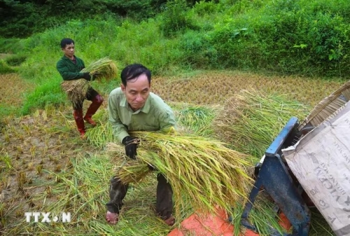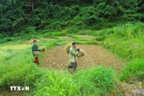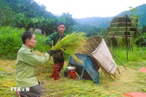 Từ sáng sớm, việc thu hoạch lúa của bà con dân bản giữa đại ngàn Pù Huống đã diễn ra. (Ảnh: Xuân Tiến/TTXVN) |