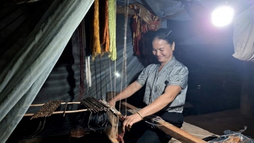 Người dân bản biên giới Cha Nga, xã Mỹ Lý tranh thủ dệt thổ cẩm khi có ánh sáng điện ổn định. |
