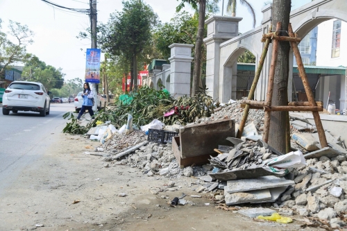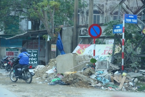 Đất, vật liệu thi công chất đống ngổn ngang giữa lòng đường. |