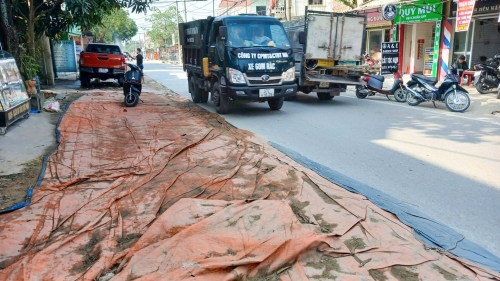 Do bùn đất và bụi bặm kéo dài, nhiều hộ dân đã phải căng bạt che chắn tạm giữa đường để hạn chế ảnh hưởng đến sinh hoạt. |