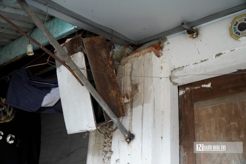 Cách khu tập thể Cọc Sợi không xa là khu tập thể Dệt may Hoàng Thị Loan - nơi có hàng chục hộ dân khác cũng đang sống trong cảnh tương tự. Qua quan sát của phóng viên, tại các căn nhà này, những mái tôn vá chằng vá đụp, tường bong tróc, cột chống nghiêng ngả… |