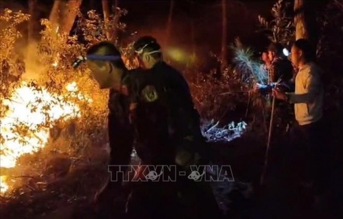Các lực lượng nhanh chóng có mặt tại hiện trường tham gia dập lửa khi đám cháy bùng phát trở lại vào đêm khuya ngày 11/4/2026. Ảnh: TTXVN phát |