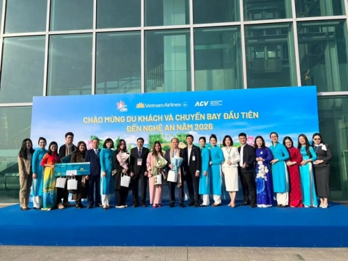 Sau khi máy bay hạ cánh, lãnh đạo Sở cùng lãnh đạo Cảng hàng không Vinh đã có mặt tại khu vực đón tiếp để chào đón, chúc mừng năm mới đối với những vị khách may mắn, đặc biệt đầu tiên trong chuyến bay đầu năm 2026 hạ cánh tại sân bay Vinh. |