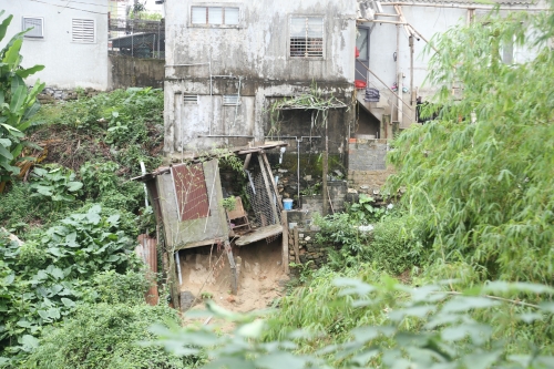 Nhiều công trình phụ phía sau nhà của một số gia đình đã nghiêng do sạt lở. Theo bà Nguyễn Thị Minh, trú tại khối Sa Nam, sau đợt bão, chuồng gà đã sập xuống lòng sông, còn sân sau và nhà tắm đã nứt và sập một nửa. Thậm chí, tường của gian nhà chính cũng đã có vết nứt đôi rộng gần bằng gang tay. Nguy cơ nhà có thể sập xuống bất cứ lúc nào. |