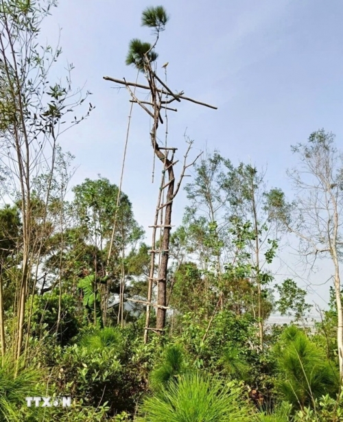 Hệ thống thang leo và chim mồi được thợ săn chim thiết lập rất quy mô trên núi để bẫy, bắt chim trời. (Ảnh: Xuân Tiến/TTXVN) |