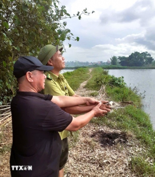 Lực lượng kiểm lâm Hạt Kiểm lâm Quỳnh Lưu-Hoàng Mai và người dân địa phương thả chim mồi về môi trường tự nhiên. (Ảnh: TTXVN phát) |